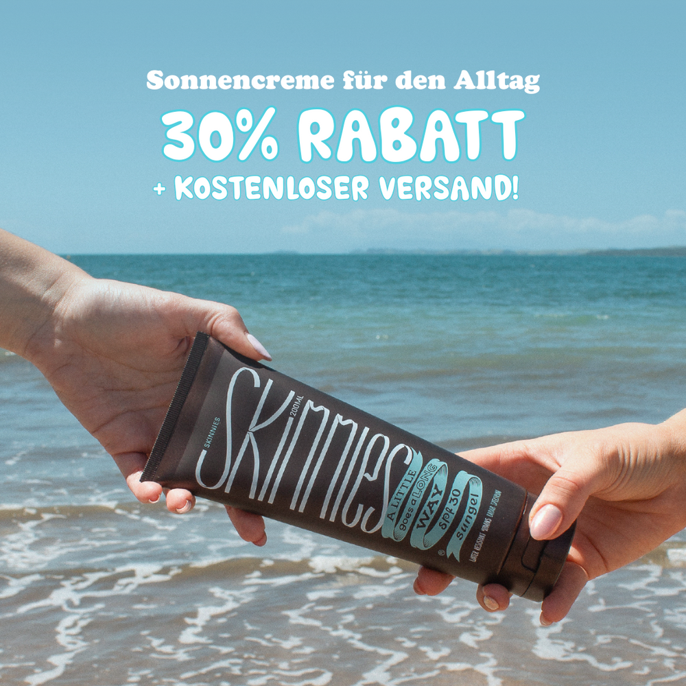 Skinnies ist ein neuartiger Sonnenschutz ohne Wasser. Mit unserem transparenten Sonnengel brauchst Du nur noch einen erbsengrossen Tropfen für das ganze Gesicht, Hals und Ohren. Skinnies fühlt sich toll auf der Haut an und bietet langanhaltenden UV-Schutz.
